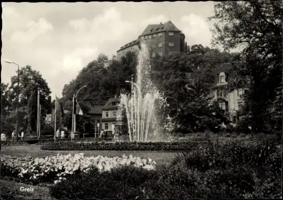 Ak Greiz im Vogtland, Springbrunnen, Platz, Burg