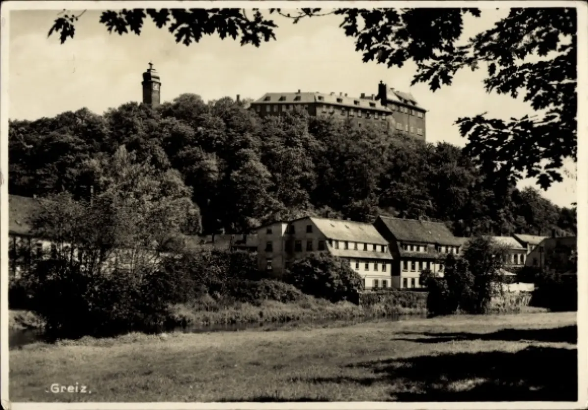 Ak Greiz im Vogtland Thüringen, Gebäude am Hang, Fluss im Vordergrund, Bäume