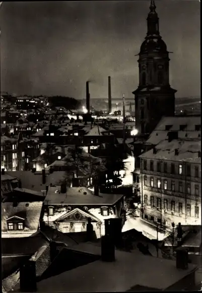 Ak Greiz in Thüringen, Blick auf Stadt und Kirche, Nachtaufnahme im Winter