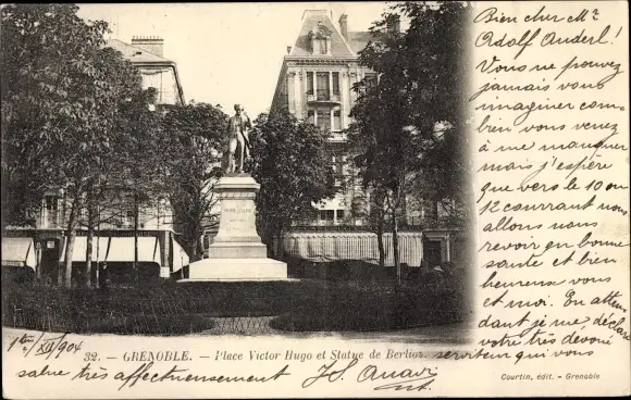 Ak Grenoble Isère, Rue Victor Hugo, Statue de Berlioz
