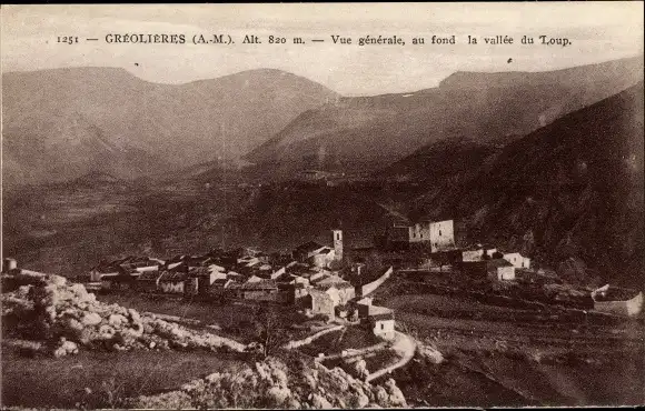 Ak Gréolières Alpes Maritimes, Vue generale, au fond la vallee du Loup