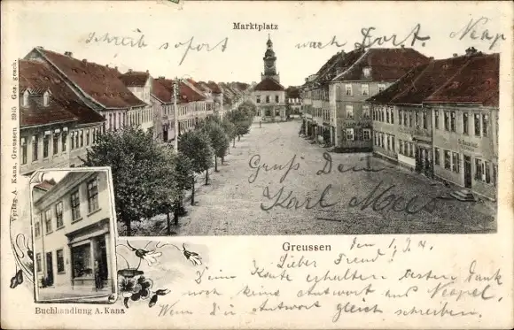 Ak Greußen in Thüringen, Marktplatz, Buchhandlung A. Kana