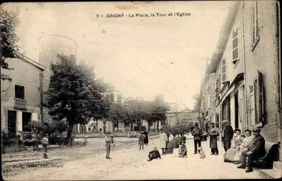 Ak Grigny Lyon Rhône, La Place, la Tour et l'Eglise