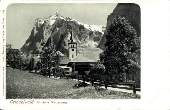 Ak Grindelwald Kanton Bern, Kirche und Wetterhorn