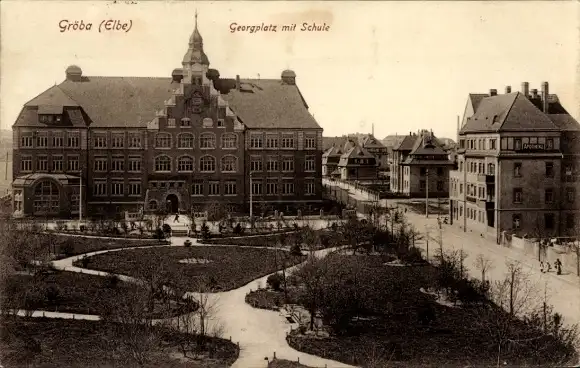 Ak Gröba Riesa an der Elbe Sachsen, Georgplatz mit Schule