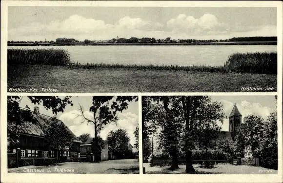 Ak Gröben Ludwigsfelde Brandenburg, Gasthaus von G. Thielicke, Kirche, Gröbener See