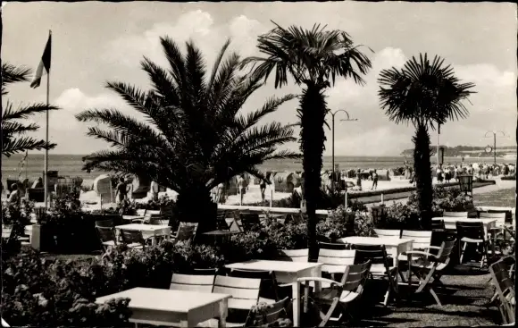 Ak Grömitz in Ostholstein, Terrasse, Palmen, Strandpartie