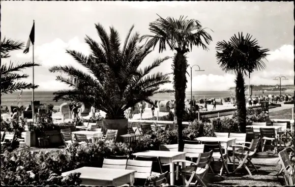 Ak Grömitz in Ostholstein, Terrasse, Palmen, Strandpartie