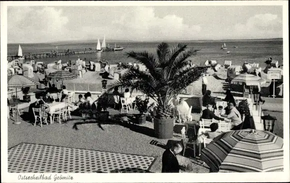 Ak Grömitz in Ostholstein, Terrasse, Strandpartie, Seebrücke, Segelboote, Caféterrasse