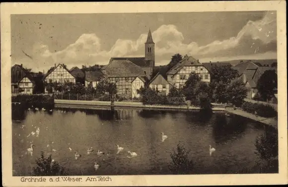 Ak Grohnde Emmerthal an der Weser, Am Teich, Kirche