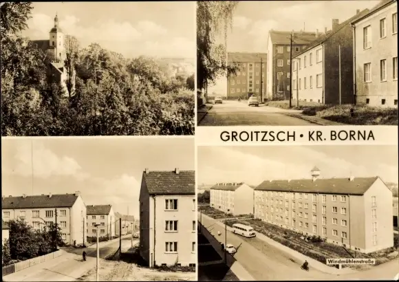 Ak Groitzsch in Sachsen, Teilansicht mit Kirche, Windmühlenstraße