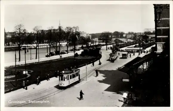 Ak Groningen Niederlande, Stationsplein, Straßenbahn