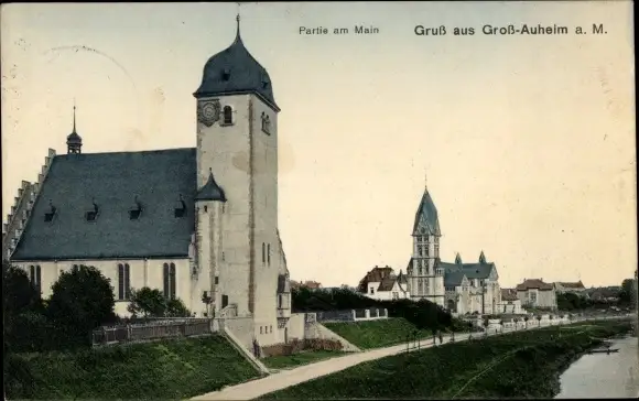 Ak Groß Auheim Großauheim Hanau am Main, Partie am Main, Kirche