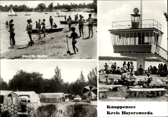 Ak Groß Särchen Lohsa in der Oberlausitz, Knappensee, Strand, Zielrichterturm, Zeltplatz