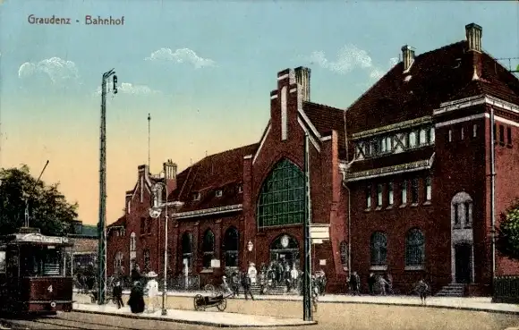 Ak Grudziądz Graudenz Westpreußen, Bahnhof, Straßenbahn