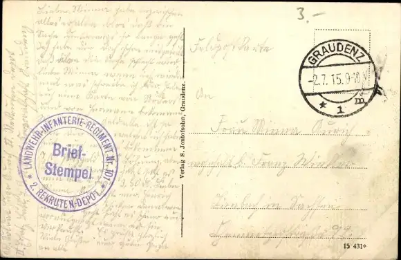Zustand, siehe Scan, gelaufen, 1915- Stempel Landwehr Infanterie Regiment 101, 2. Rekruten Depot - ca 14 cm X 9 cm