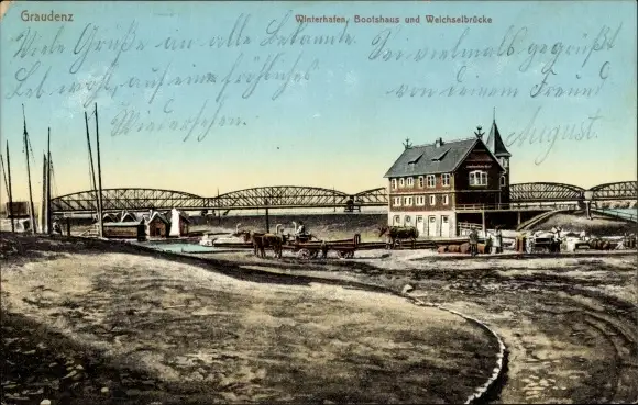 Ak Grudziądz Graudenz Westpreußen, Winterhafen, Bootshaus, Weichselbrücke