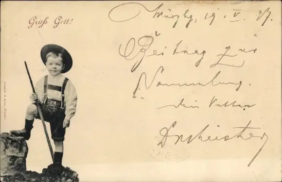 Ak Grüß Gott, Junge in bayrischer Tracht, Lederhose