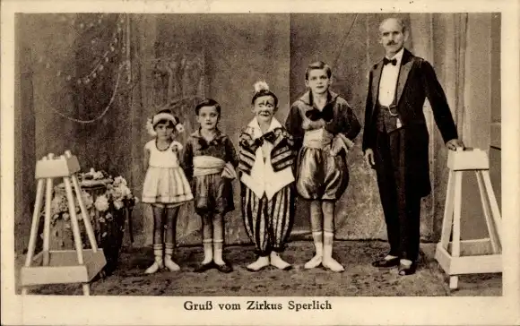 Ak Gruß vom Zirkus Sperlich, Artisten, Kinder, Clown