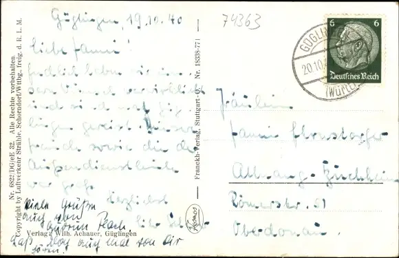 Zustand, siehe Scan, gelaufen, 1940 - ca 14 cm X 9 cm