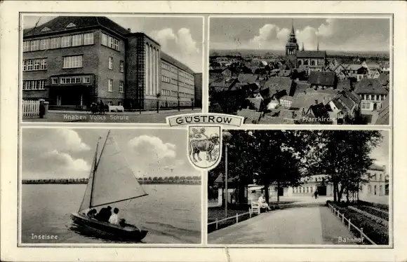 Ak Güstrow in Mecklenburg, Pfarrkirche, Inselsee, Bahnhof, Knaben-Volksschule