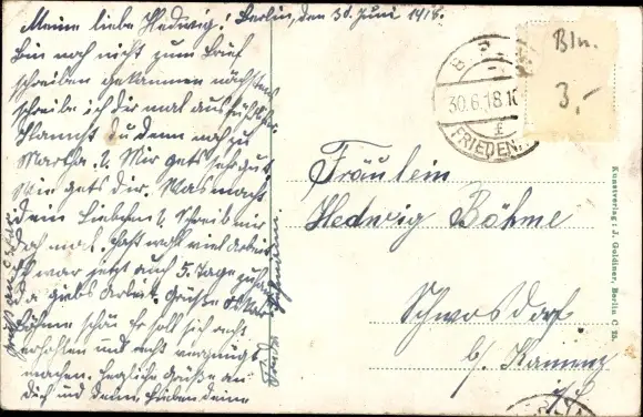 gelaufen 1918, Briefmarke entfernt, Eckknick rechts oben, sonst guter Zustand