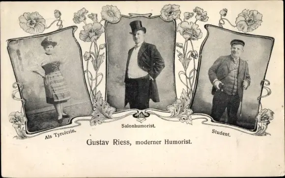 Ak Gustav Riess, moderner Humorist in seinen Rollen, Tyrolerin, Salonhumorist, Student