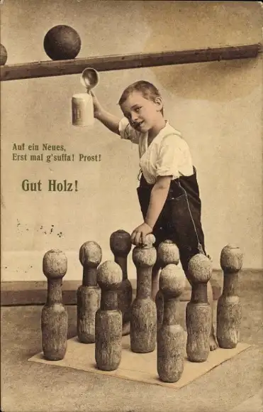 Ak Gut Holz, Junge mit Bierkrug, Kegelbahn