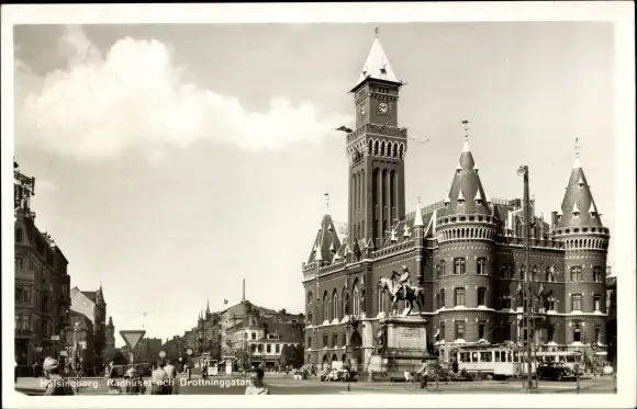 Ak Hälsingborg Helsingborg Schweden, Radhuset och Drottninggatan