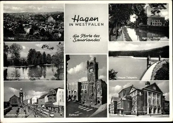 Ak Hagen in Westfalen, Totalansicht von Ort, Hasper Talsperre, Volme, Stadthalle, Schwanenteich