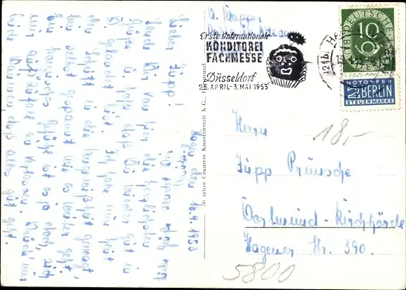 gelaufen 1953, Sonderstempel Erste Internat. Konditorei Fachmesse Düsseldorf 25. April - 3. Mai 1953, Ecken bestoßen, sonst guter Zustand