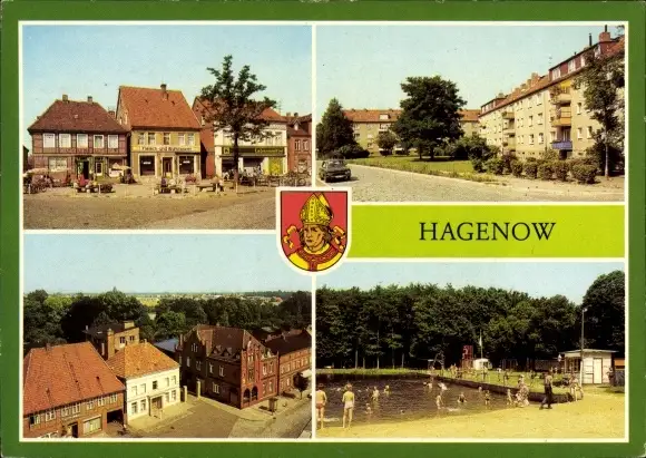 Ak Hagenow in Mecklenburg, Rudolf-Breitscheid-Platz, AWG-Siedlung, Teilansicht, Freibad