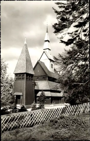 Ak Hahnenklee Bockswiese Goslar im Harz, Gustav-Adolf-Kirche, Nordische Stabkirche