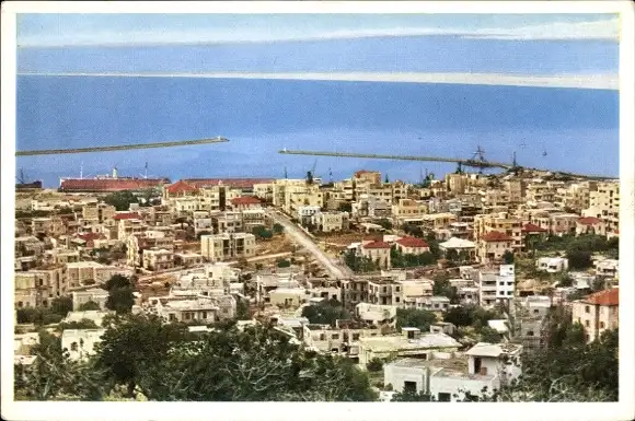 Ak Haifa Israel, Panoramablick auf eine Stadt, Meer im Hintergrund, beeindruckende Architektur