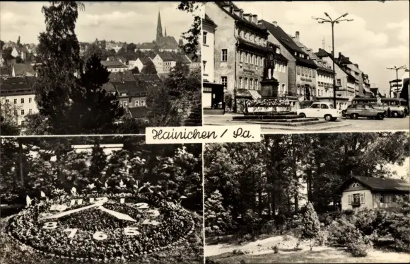 Ak Hainichen in Sachsen, Teilansicht, Blumenuhr, Denkmal