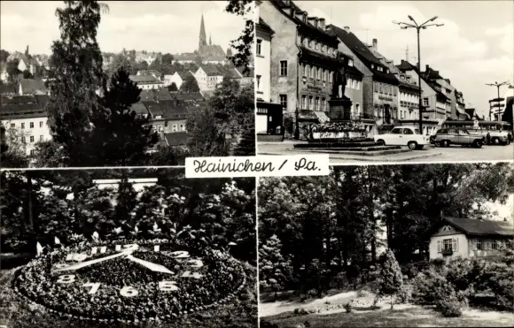 Ak Hainichen in Sachsen, Teilansicht, Blumenuhr, Denkmal