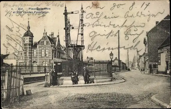 Ak Hal Flämisch Brabant Flandern, Place de la Gare et Rue Vandenpeereboom