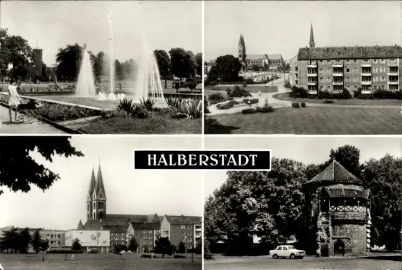 Ak Halberstadt am Harz, Springbrunnen am Breiten Weg, Lindenweg, Blick zum Dom, Wassertor