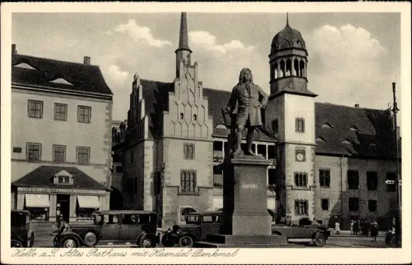 Ak Halle an der Saale, Altes Rathaus mit Händel Denkmal, Buchhandlung, Autos