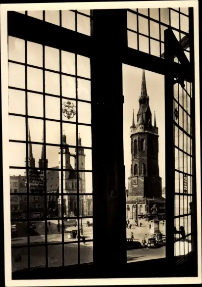Ak Halle an der Saale, Partie am Rathausfenster, Kirche, Marktplatz
