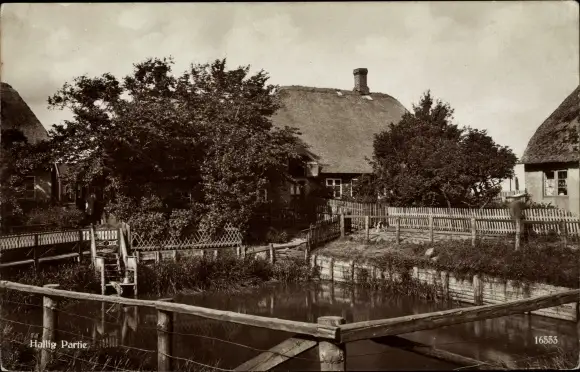 Ak Hallig Hooge in Nordfriesland, Dorfpartie, Reetdachhäuser