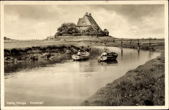 Ak Hallig Hooge in Nordfriesland, Kirchwarf, Ruderboot