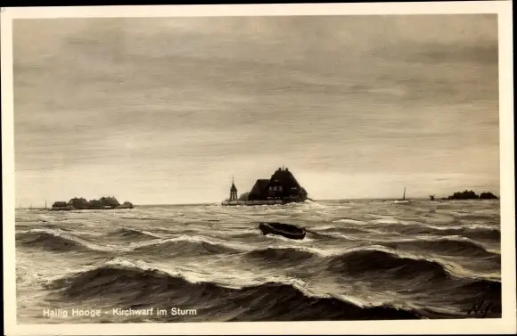 Ak Hallig Hooge in Nordfriesland, Kirchwarft im Sturm