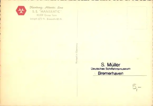 Ak Hamburg Atlantic Linie, Schnelldampfer SS Hanseatic