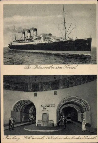 Ak Hamburg, Dampfschiff Cap Polonio über dem Elbtunnel, Blick in die beiden Tunnel, HSDG