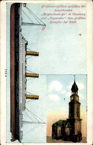 Ak Hamburg, Größenverhältnis Michaeliskirche und HAPAG-Dampfer Imperator