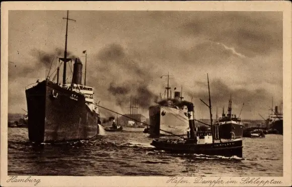 Ak Hamburg, Hafen, Dampfer im Schlepptau