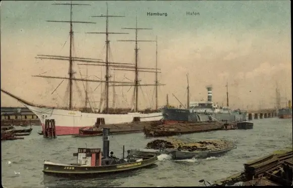 Ak Hamburg, Hafen, Segelschiff, Dampfer, Schlepper
