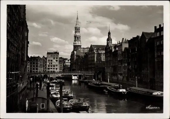 Ak Hamburg Mitte Altstadt, Catharinen-Fleet, Boote, Kirche