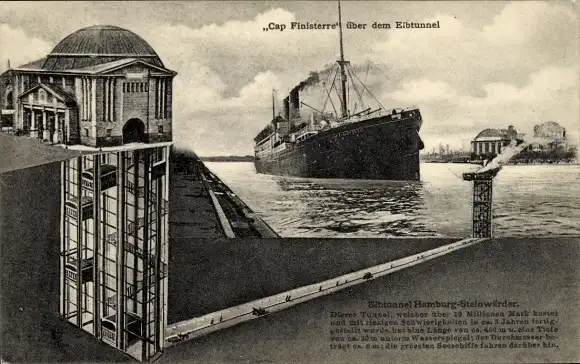 Ak Hamburg, Schnelldampfer Cap Finisterre, Elbtunnel nach Steinwärder